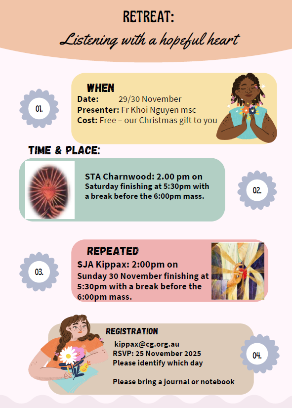 Time & Place: SJA Kippax: 2:00pm on Sunday finishing at 5:30pm with a break before the 6:00pm mass.